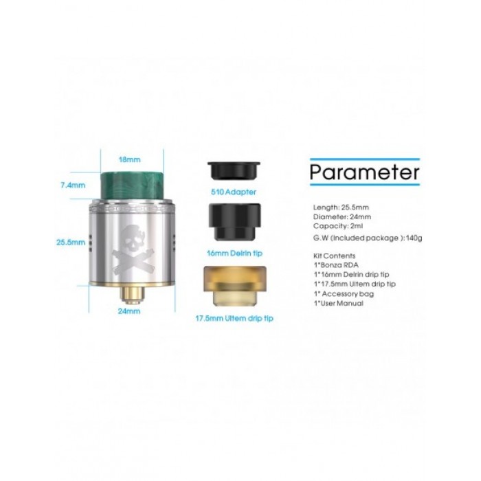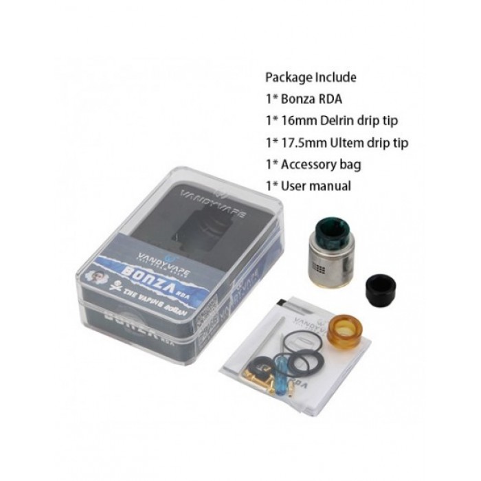 Vandy Vape Bonza RDA 2ml InstructionsFeatures: ●24mm diameter ●2ml liquid capacity ●Food grade drip tip ●Single and dual coil configuration ●Bottom fe..